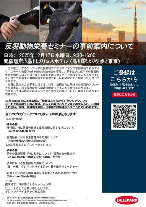 ラレマンドが12月17日に反芻動物栄養セミナー 2025/11/19 17:00 文字サイズ 小 中 大 ラレマンドバイオテック(東京)は12月17日午前9時30分から、東京・品川プリンスホテルで「反芻動物栄養セミナー」を開く。 カナダ・ゲルフ大学反芻動物アニマルサイエンス学部のマイク・スチール教授を招き、子牛と成牛での腸管微生物をいかにコントロールするかを主題に行う。関連する農場段階での管理や新しい知見なども紹介する。 講演はすべて日本語・英語の同時通訳。参加登録は同社サイトから。問い合わせは同社(電話03・5418・8181)まで。 無断転載禁止