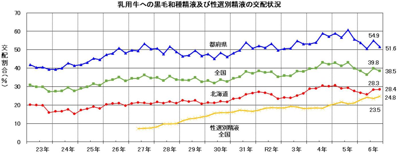 乳用牛への性選別精液の利用率が過去最高に 2025/03/19 17:30 文字サイズ 小 中 大 日本家畜人工授精師協会が19日までにまとめた2024年第4四半期(10~12月期)の乳用牛の性選別精液の利用割合(速報値)は、全国で前期比1.3㌽増の24.8%(前年比3.7㌽増)と過去最高を更新した。 同協会はその背景について「酪農家がF1(交雑初生牛... この記事は購読者限定です 2週間無料試読 購読お申し込み